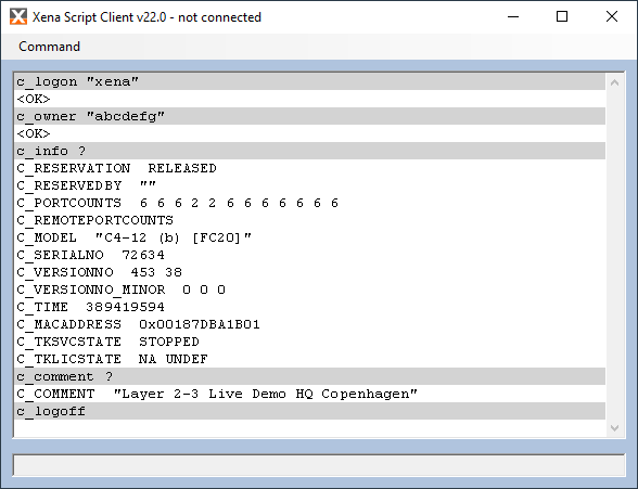 Xena also provides a simple interactive scripting client application, XenaScriptClient, that runs on Windows and allows you to manually type commands to the chassis and see its responses.